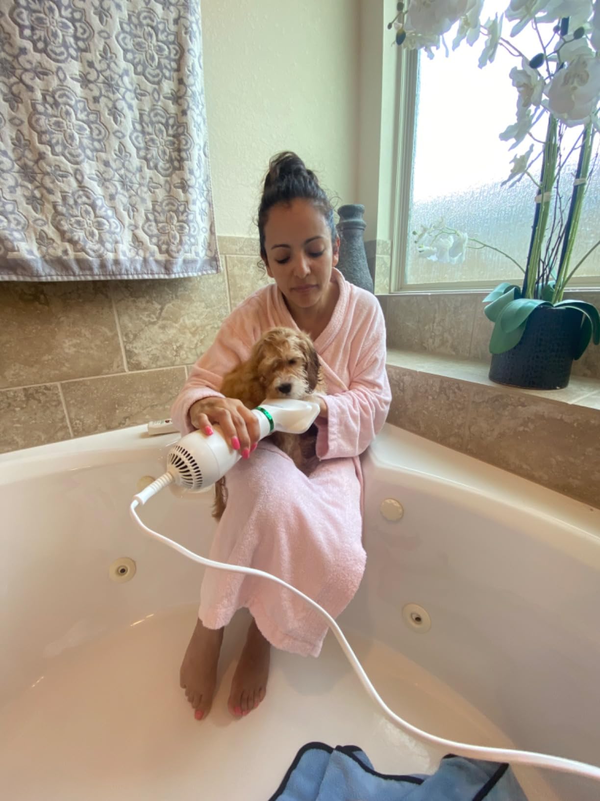 dice que ahora sus mascotas se relajan mientras se secan y se peinan al mismo tiempo.