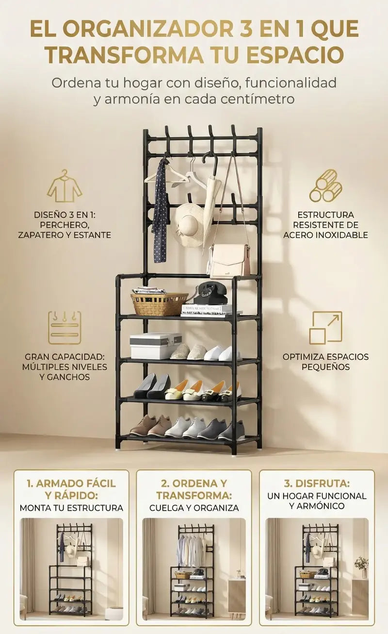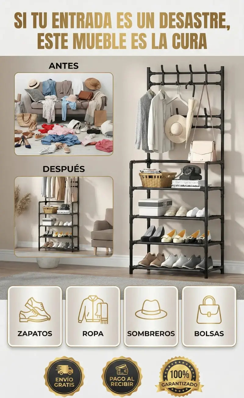 Soporta peso distribuido en los niveles inferiores para zapatos y cajas, y ropa pesada en los ganchos superiores (abrigos, mochilas, bolsos) sin perder estabilidad.