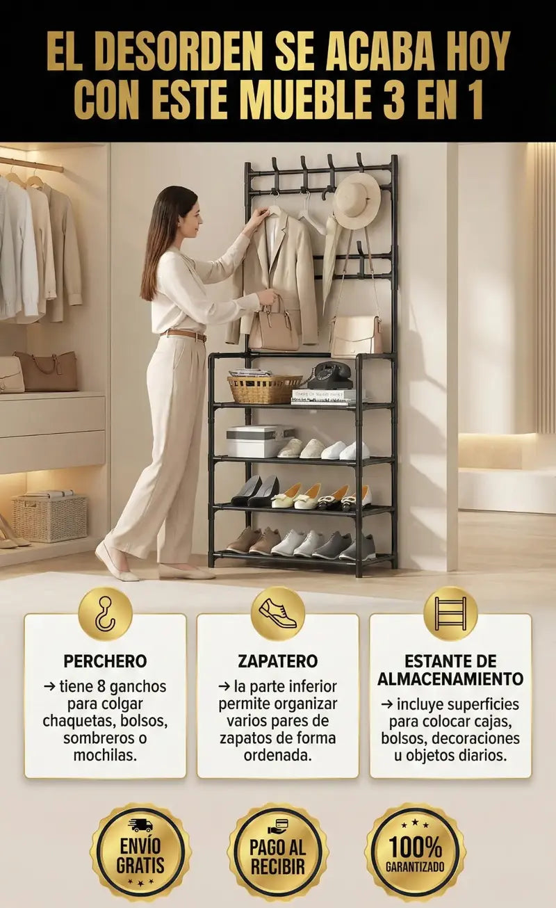 Gracias a estas dimensiones, el organizador aprovecha el espacio en vertical, permitiendo almacenar zapatos y colgar ropa sin invadir áreas de paso. Es lo suficientemente alto para maximizar capacidad y lo bastante compacto para encajar en entradas, recámaras, departamentos pequeños o esquinas.