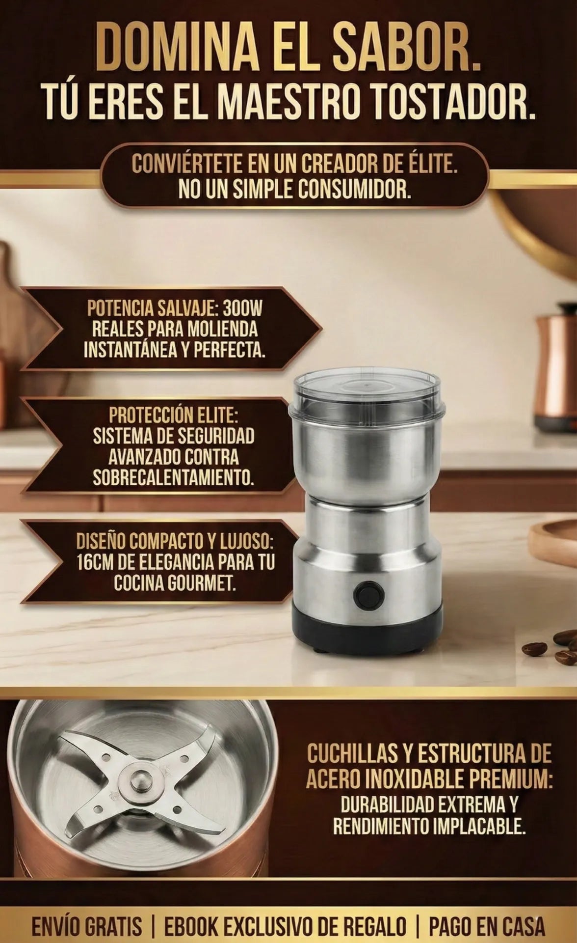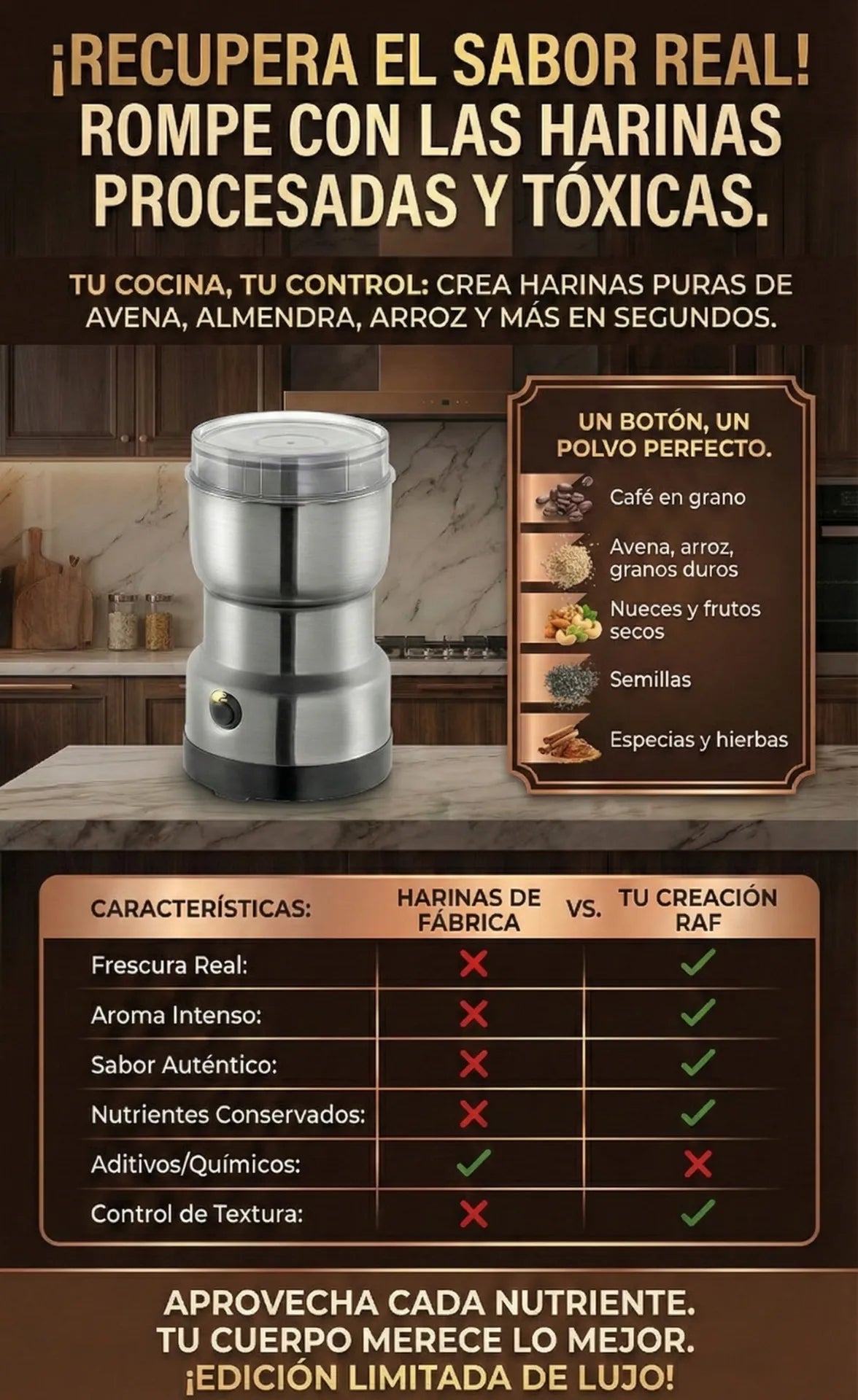 Puedes triturar café, semillas, chía, linaza, arroz, especias, frutos secos, granos y más. Es ideal para preparar harinas caseras, condimentos y café fresco al instante.