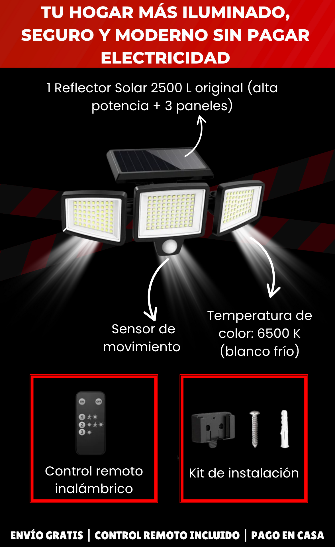 Muy fácil: solo debes instalarlo en una pared donde reciba luz solar directa ☀️. Durante el día, su panel carga automáticamente la batería interna y, al llegar la noche, se enciende solo cuando detecta movimiento o puedes controlarlo con el control remoto. ¡Sin cables, sin instalaciones complicadas y sin pagar un peso en electricidad!