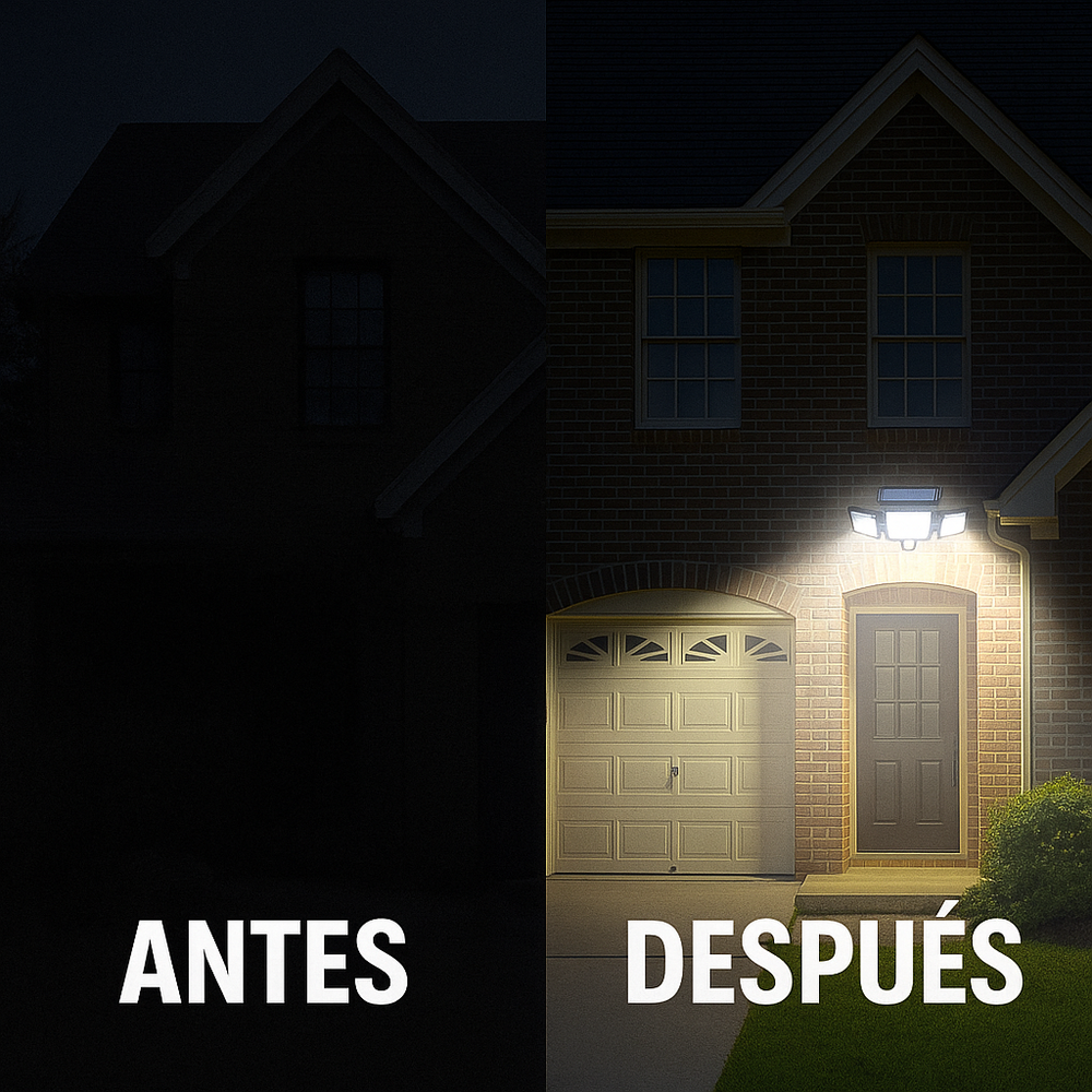 Con este reflector solar de 2500 lúmenes, tu hogar estará protegido y completamente iluminado cada noche. Ya no tendrás que preocuparte por cables, baterías o facturas altas: se carga automáticamente con la luz del sol y se enciende solo al anochecer.