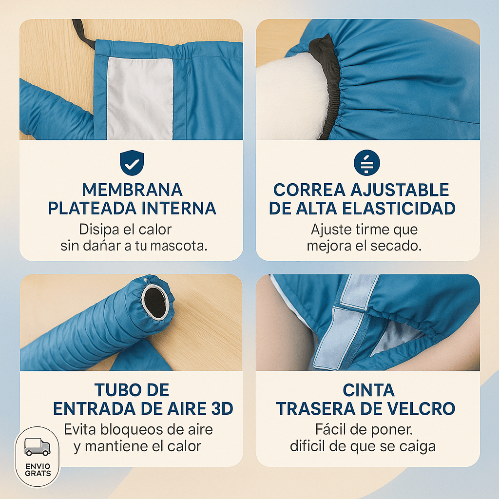Incluye la bolsa/abrigo de secado rápido hecha en tela Oxford de alta densidad, entradas laterales para conectar la secadora, ajustes de seguridad en cuello y patas, y un manual sencillo para usarla en minutos.