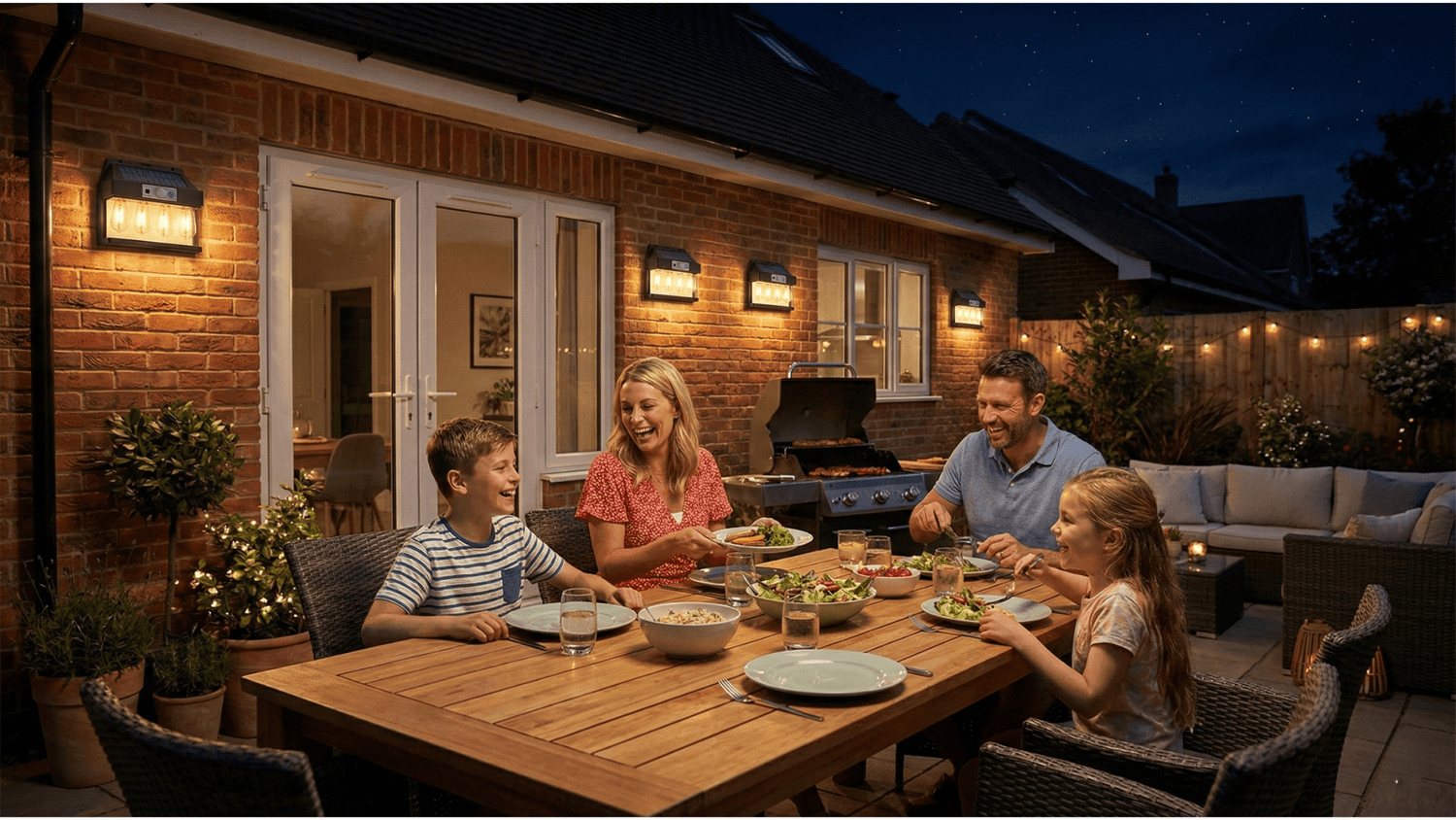 Esa energía se almacena en su batería interna y, cuando oscurece, su sensor de luz inteligente activa automáticamente los 4 focos LED, iluminando tu fachada, patio o entrada sin que tengas que hacer nada.
