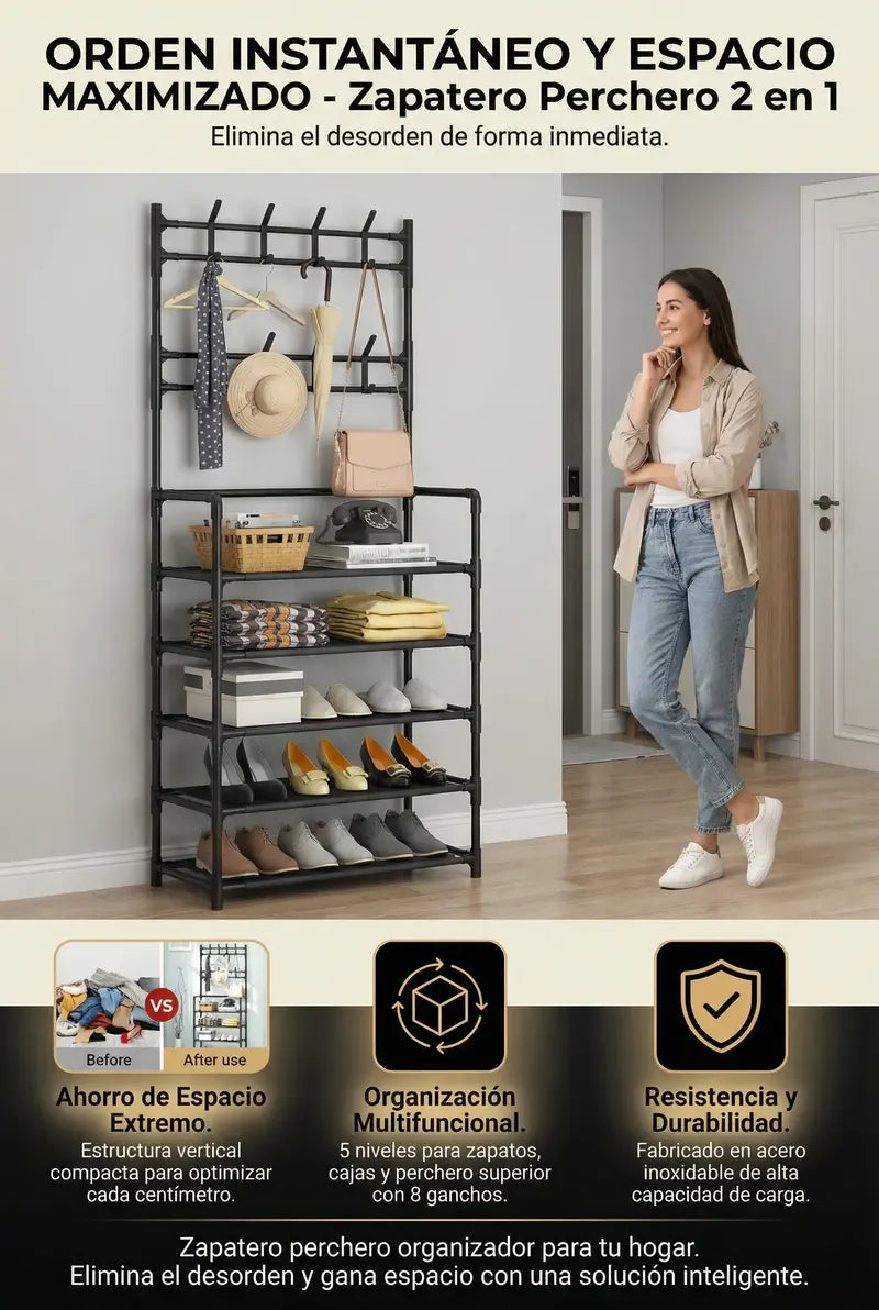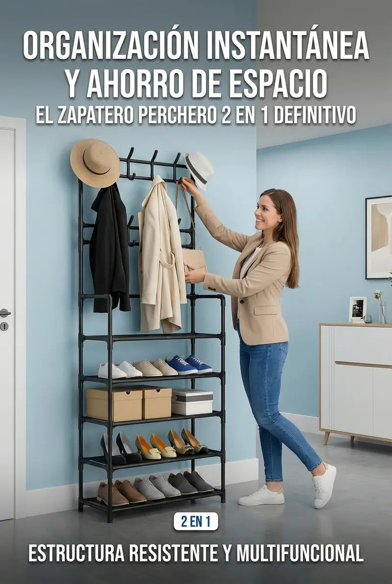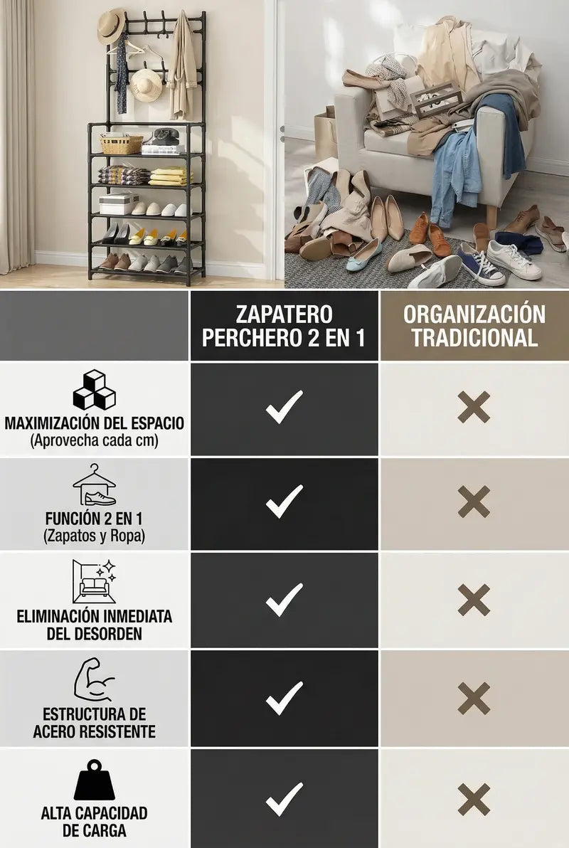 Soporta peso distribuido en los niveles inferiores para zapatos y cajas, y ropa pesada en los ganchos superiores (abrigos, mochilas, bolsos) sin perder estabilidad.