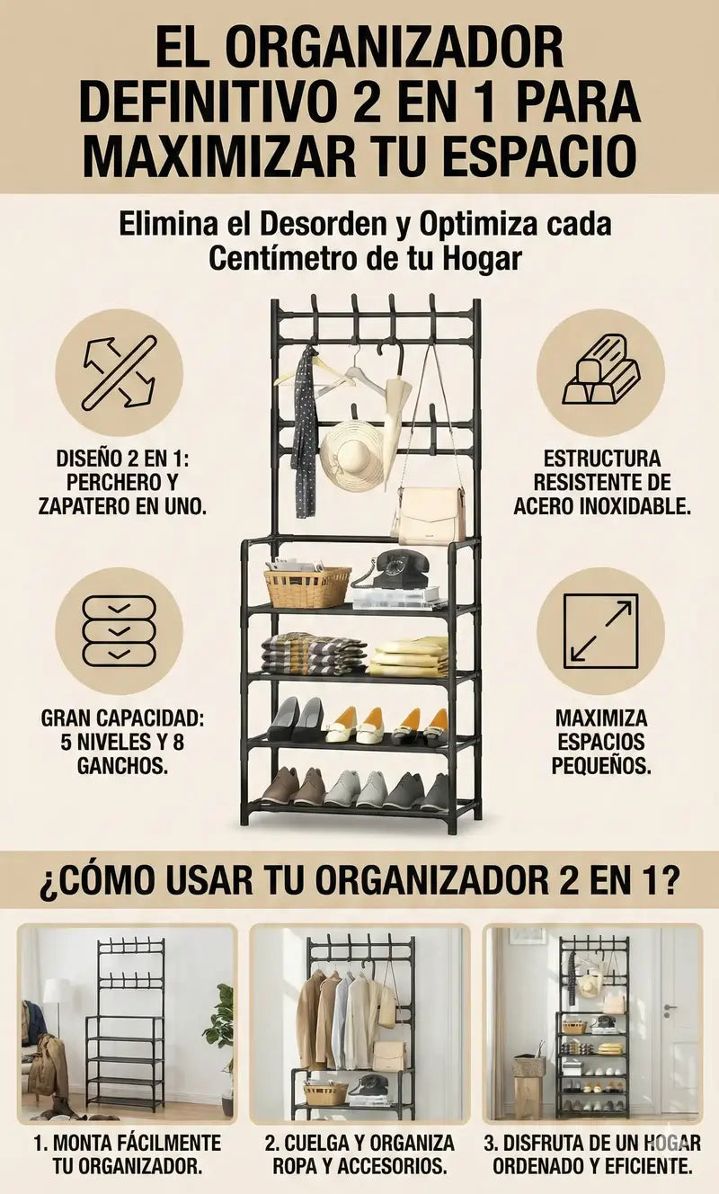 Gracias a estas dimensiones, el organizador aprovecha el espacio en vertical, permitiendo almacenar zapatos y colgar ropa sin invadir áreas de paso. Es lo suficientemente alto para maximizar capacidad y lo bastante compacto para encajar en entradas, recámaras, departamentos pequeños o esquinas.